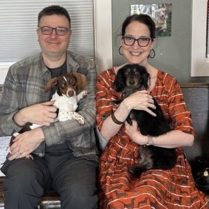 The family of the late Norm the Dachshund—and Gertie’s (Jovial 2024) —reached out about Gadzooks! Jennifer and Clint Turney of Allen, TX, are beloved repeat adopters, and they were eager to see whether he might be the next perfect addition to their crew. Gertie came along to give him the official once‑over before offering her approval, while Abner waited patiently at home.