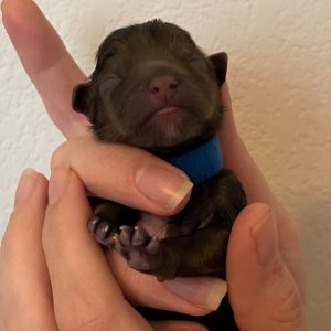 This little boy wearing a blue collar is a solid dark chocolate color.
