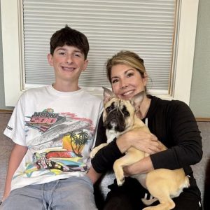 Rochelle and her son, Austin, came to meet her, and after a few minutes we gently placed Meadow in Rochelle’s lap. That’s when she finally softened—melting into the pets she was offered, even though she was still clearly terrified. It’s hard to imagine being only seven months old and having your entire world turned upside down. Her puppy mill life was awful, but it was all she had ever known. Suddenly she was in a big room, surrounded by new people, unsure of what would happen if she moved. Who knows what must have been running through her mind.