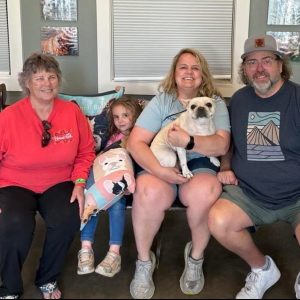 Leslie and Jason Gardner, from Murphy, TX, are previous adopters of Flirt (now Peanut) and Ms. O’Brien (now Maggie). They reached out to us about several of our French Bulldogs, wanting to ensure that one would be a good fit with their current dogs. They visited the Sanctuary and met a few of our pups, and it was Moonstruck who stole their hearts! However, Moonstruck had some medical issues that needed to be addressed during her spay, so they decided to wait until after their vacation to bring her home.