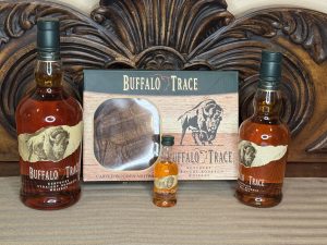 A carved wooden ashtray, authorized by the Buffalo Trace distillery with 3 fingers for cigars. And paired with three bottles of Buffalo Trace Bourbon. The bottle sizes are .750ml, .350ml, and a mini .50ml