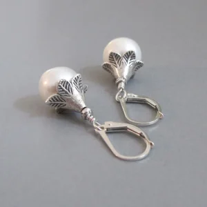 Beautiful creamy white freshwater Pearls capped in handmade solid fine silver petals drop from sterling silver lever back ear wires.